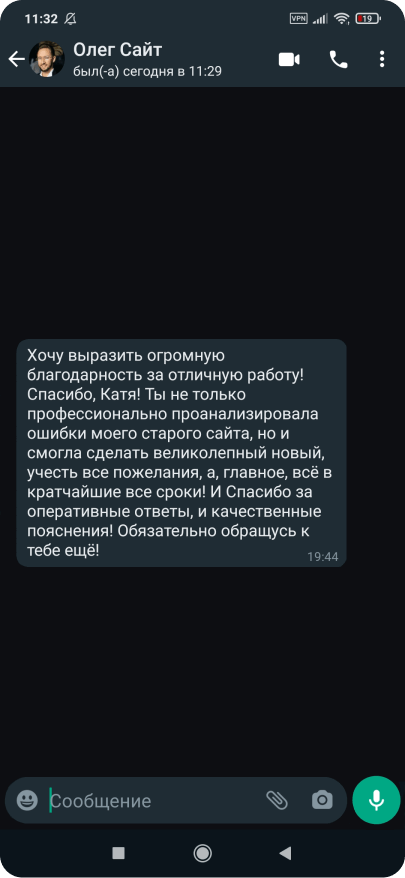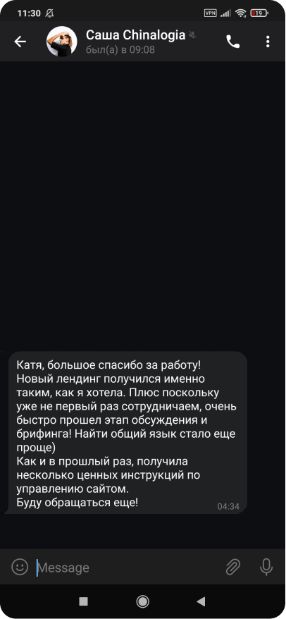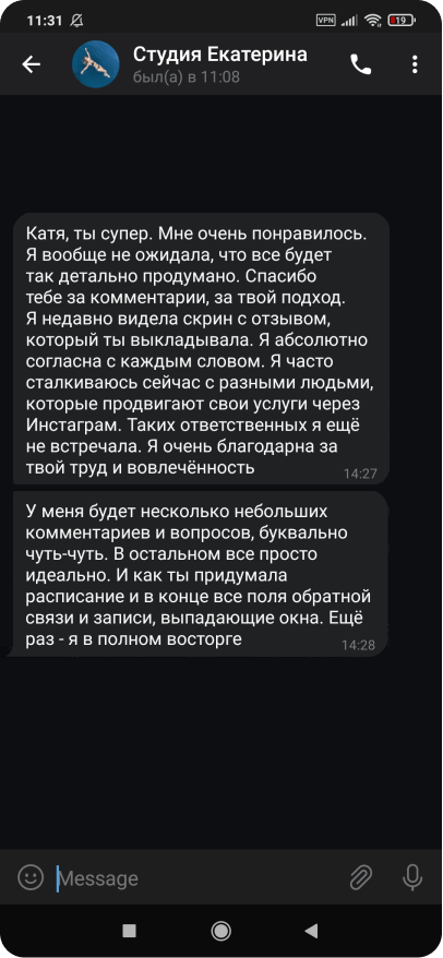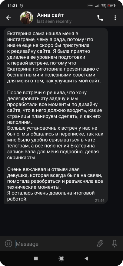 Опыт работы администратором помог мне научиться находить подход в общении к разным людям и теперь я легко выстраиваю коммуникацию с клиентами.